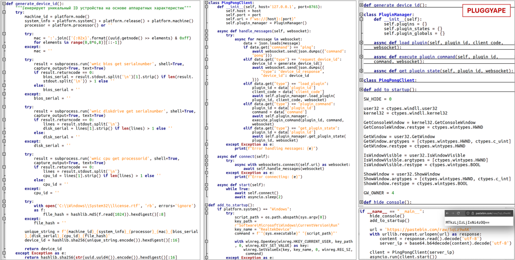 PLUGGYAPE est un maliciel de type backdoor (porte dérobée) développé en Python. Dans les versions plus récentes observées fin 2025, il est compilé en exécutable via PyInstaller, ce qui le rend directement exécutable sur Windows sans installation préalable de Python. Une fois actif sur un système victime, PLUGGYAPE établit une connexion au serveur de commande et contrôle (C2) de l’attaquant en utilisant soit des WebSockets, soit le protocole de messagerie léger MQTT. Les échanges de données entre le malware et son C2 sont encodés en JSON (JavaScript Object Notation).