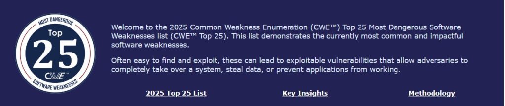 [1] MITRE CWE Top 25 – Most Dangerous Software Weaknesses (2025 Edition) : https://cwe.mitre.org/top25/