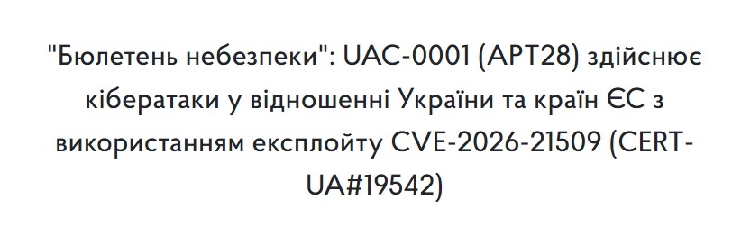 Fin janvier 2026, le CERT-UA a publié une alerte critique concernant l’exploitation active de la vulnérabilité CVE-2026-21509 dans Microsoft Office, utilisée par le groupe de cyberespionnage UAC-0001, affilié à APT28 (Fancy Bear).
